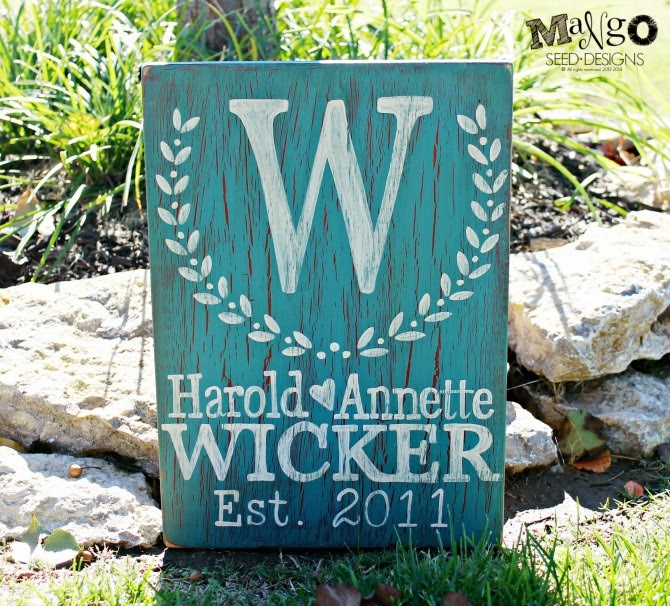 Personalize with the happy couples last name initial, first names & year they were married. The size is approximately 11x16 and painted on pine.